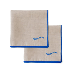 Dit paar servetten van 100% linnen in een elegante beige kleur, met speels wavy borduurwerk in contrasterend blauw, voegt een vleugje verfijning toe aan de eettafel.