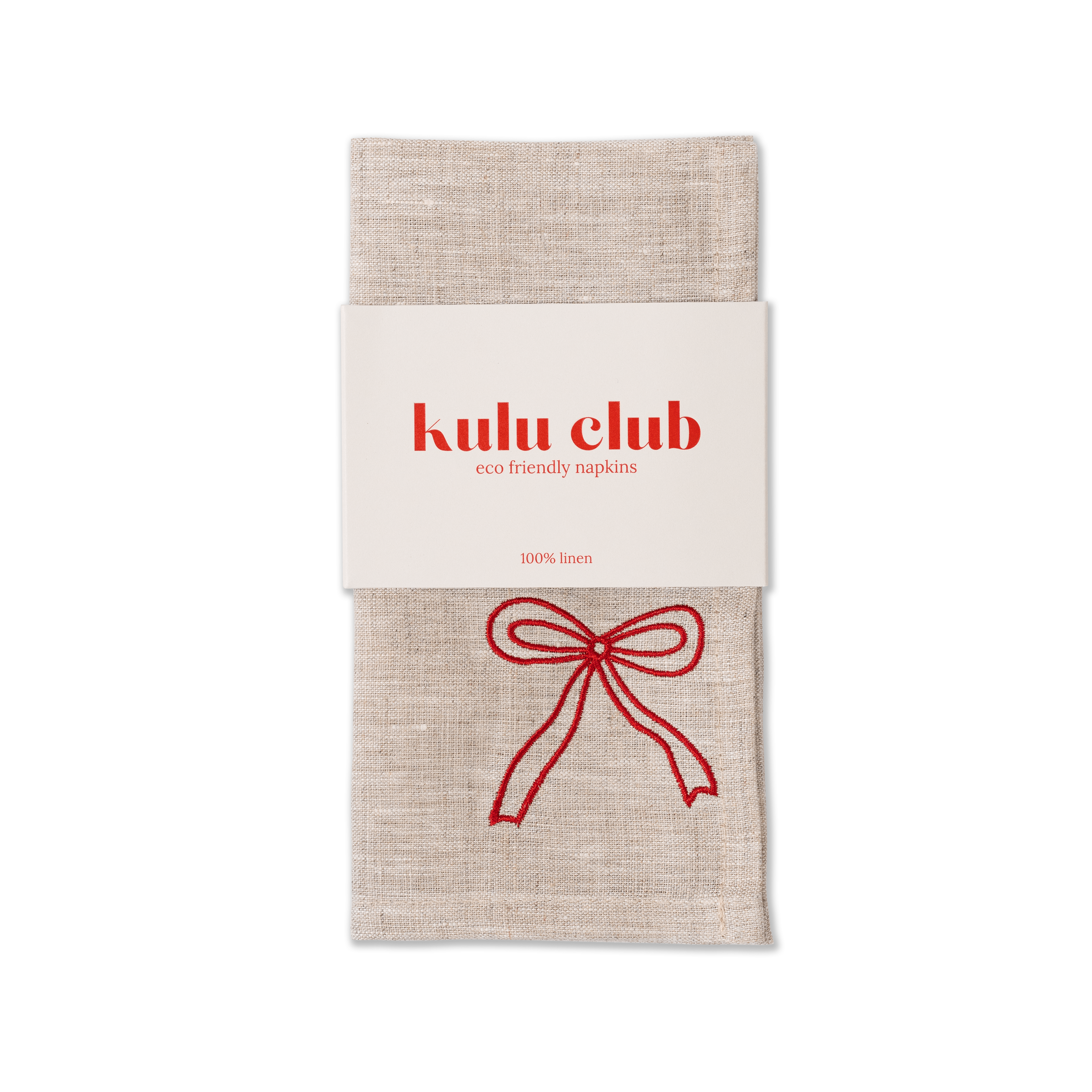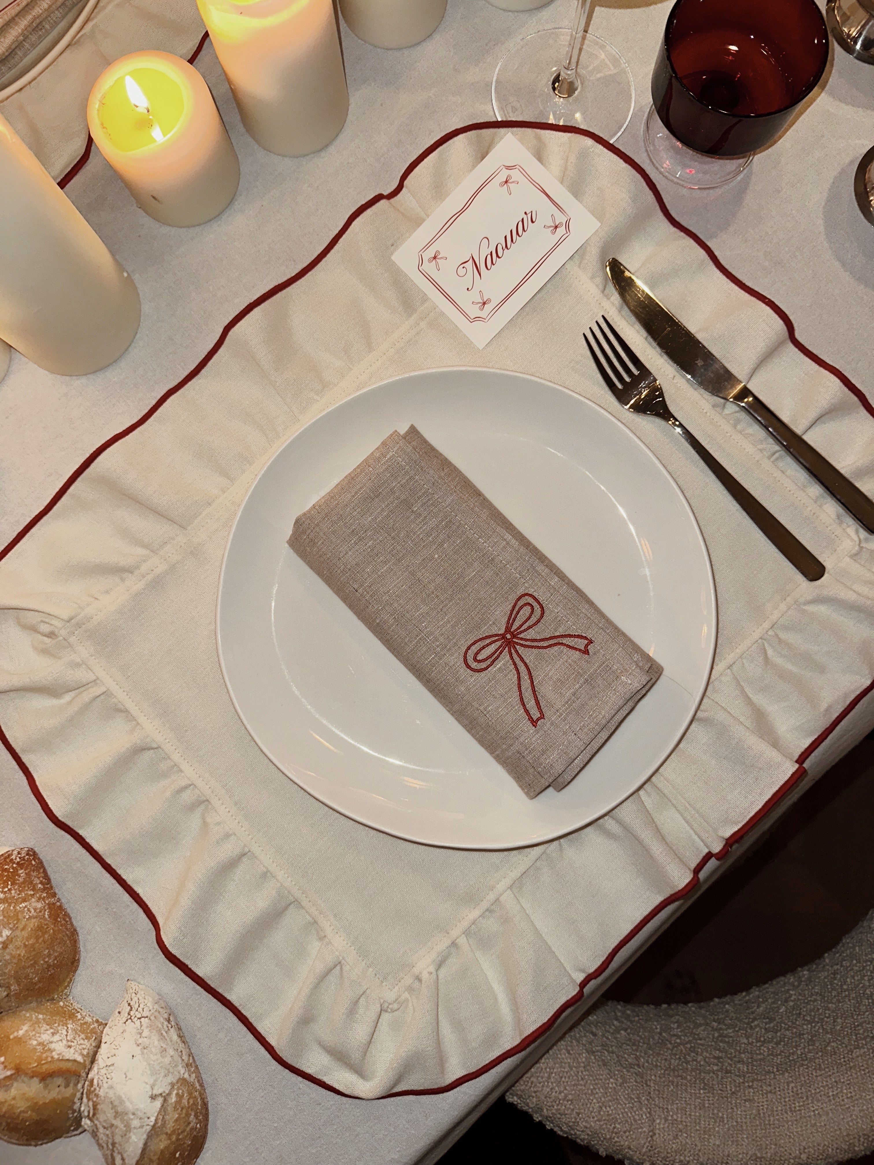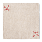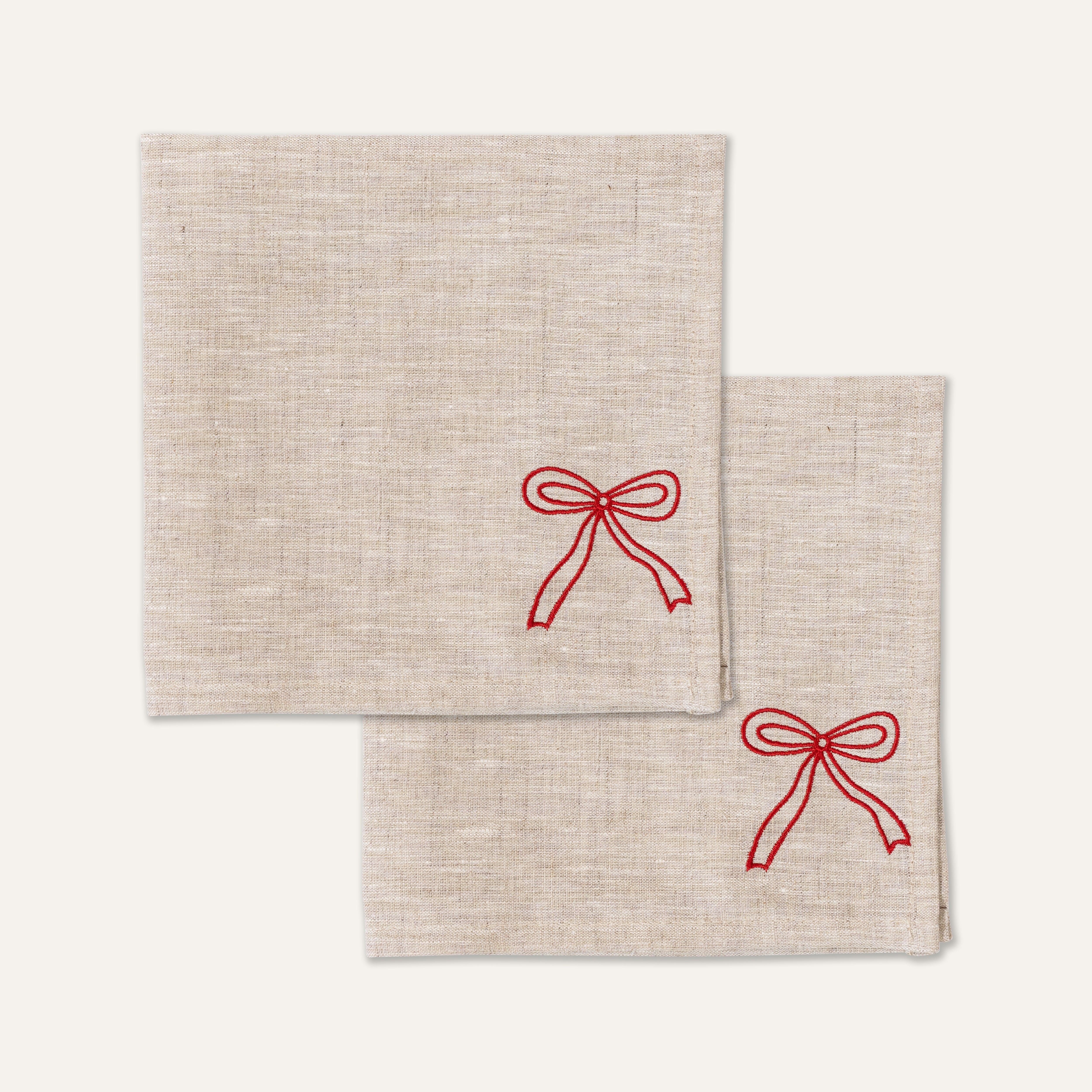 Dit paar 100% linnen servetten in beige, met een mooie strik in rood geborduurd op beide uiteinden, voegt een gedurfde en speelse touch toe aan je eettafel.