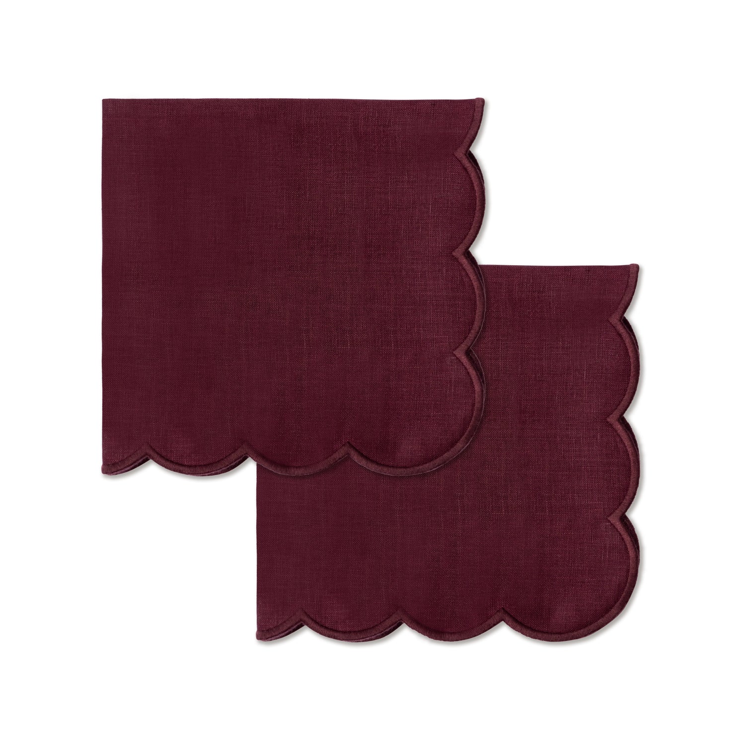 Dit paar servetten van 100% linnen van de Kulu Club x Moderosa collectie in een diepe aubergine kleur, met een chique scallop geborduurde rand, voegt een vleugje verfijning toe aan de eettafel.