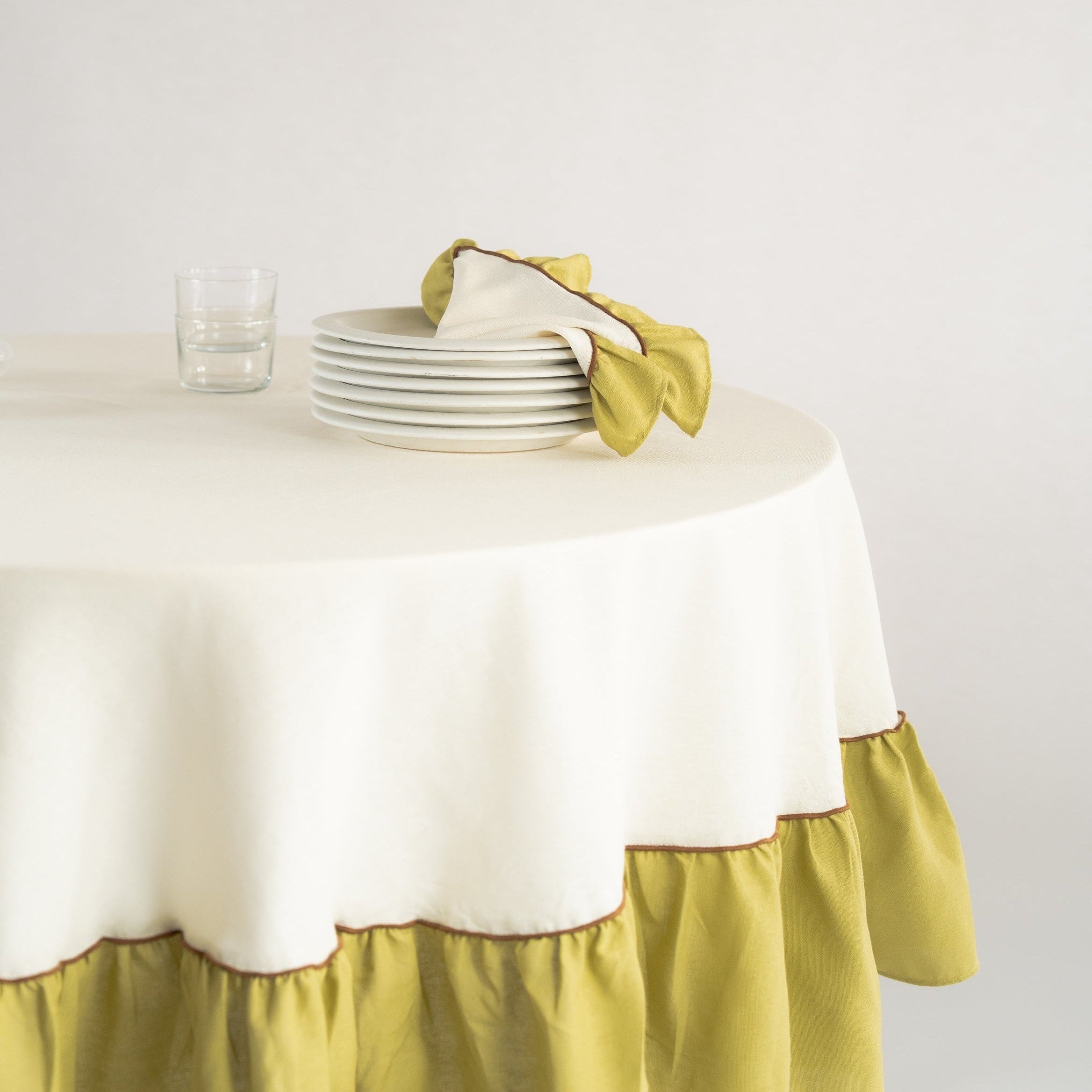 Breng zachtheid en elegantie naar je eettafel met dit ronde ivoorwitte tafelkleed met een groene ruffle en bruine overlock rand van Kulu Club. De romantische volant-rand geeft een speelse twist aan een klassieke basis en maakt elke maaltijd bijzonder, of het nu een uitgebreid diner is of een intieme lunch.