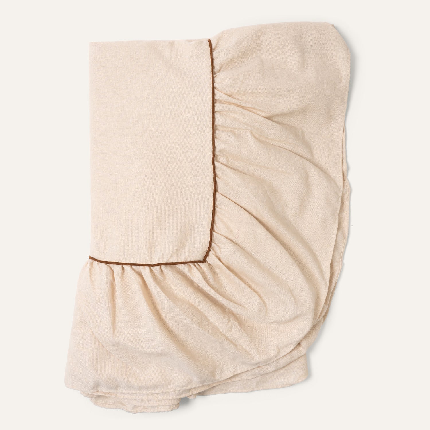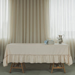 Breng zachtheid en elegantie naar je eettafel met dit beige ruffle tafelkleed en bruine overlock rand van Kulu Club. De romantische volant-rand geeft een speelse twist aan een klassieke basis en maakt elke maaltijd bijzonder, of het nu een uitgebreid diner is of een intieme lunch.