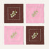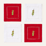 De set bevat twee felrode en twee frisse witte onderzetters, allemaal vervaardigd van hoogwaardig linnen en afgewerkt met een elegante decoratieve zoom. Elke onderzetter is versierd met een speelse martini-olijf borduursel. Stijlvol, vrolijk en perfect voor feestelijke diners en borrels.