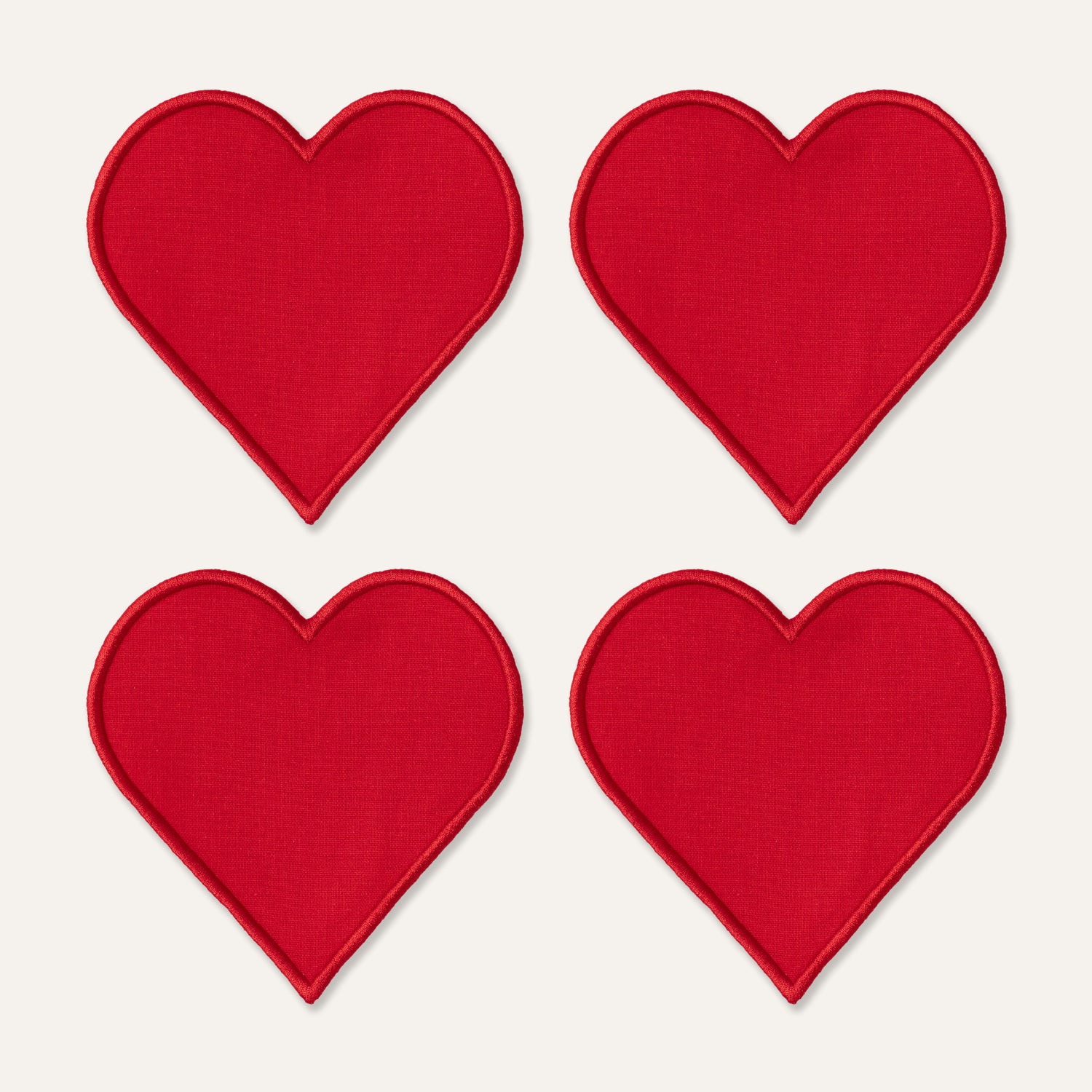This set includes four heart-shaped coasters in vibrant red linen with a slightly darker red overlock finish.