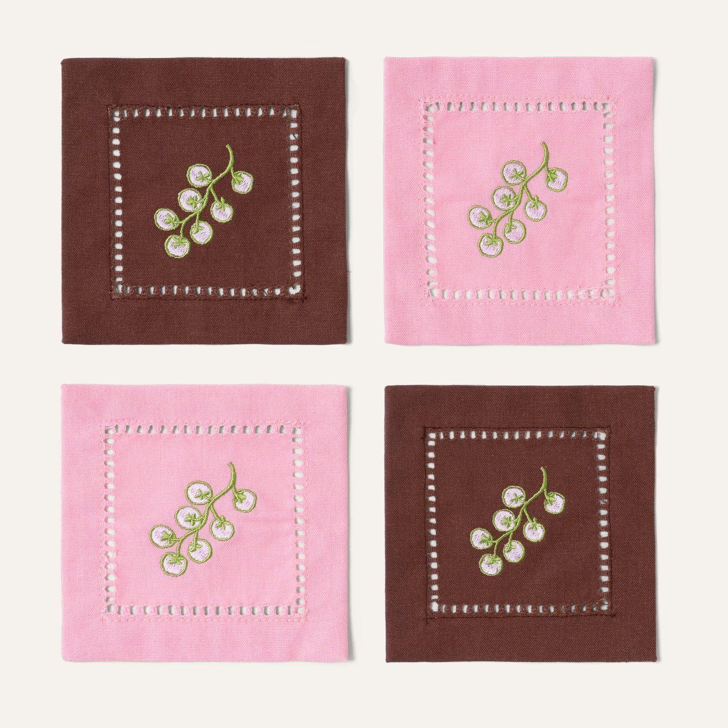 The set includes two deep brown and two soft pink coasters, all crafted from premium linen with an elegant hemstitch border. Each one features a tomato cluster embroidery. Playful, stylish, and perfect for festive hosting.