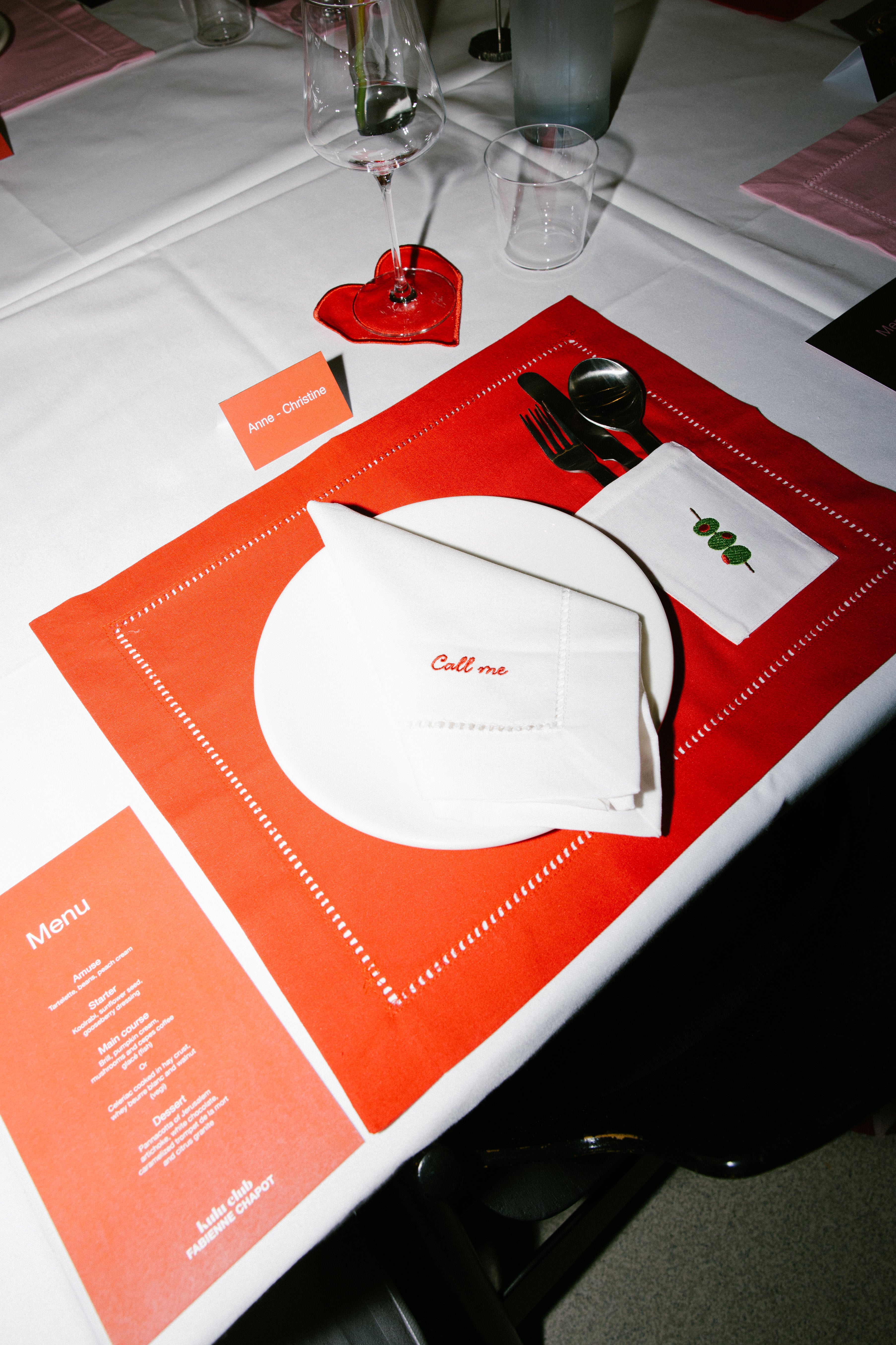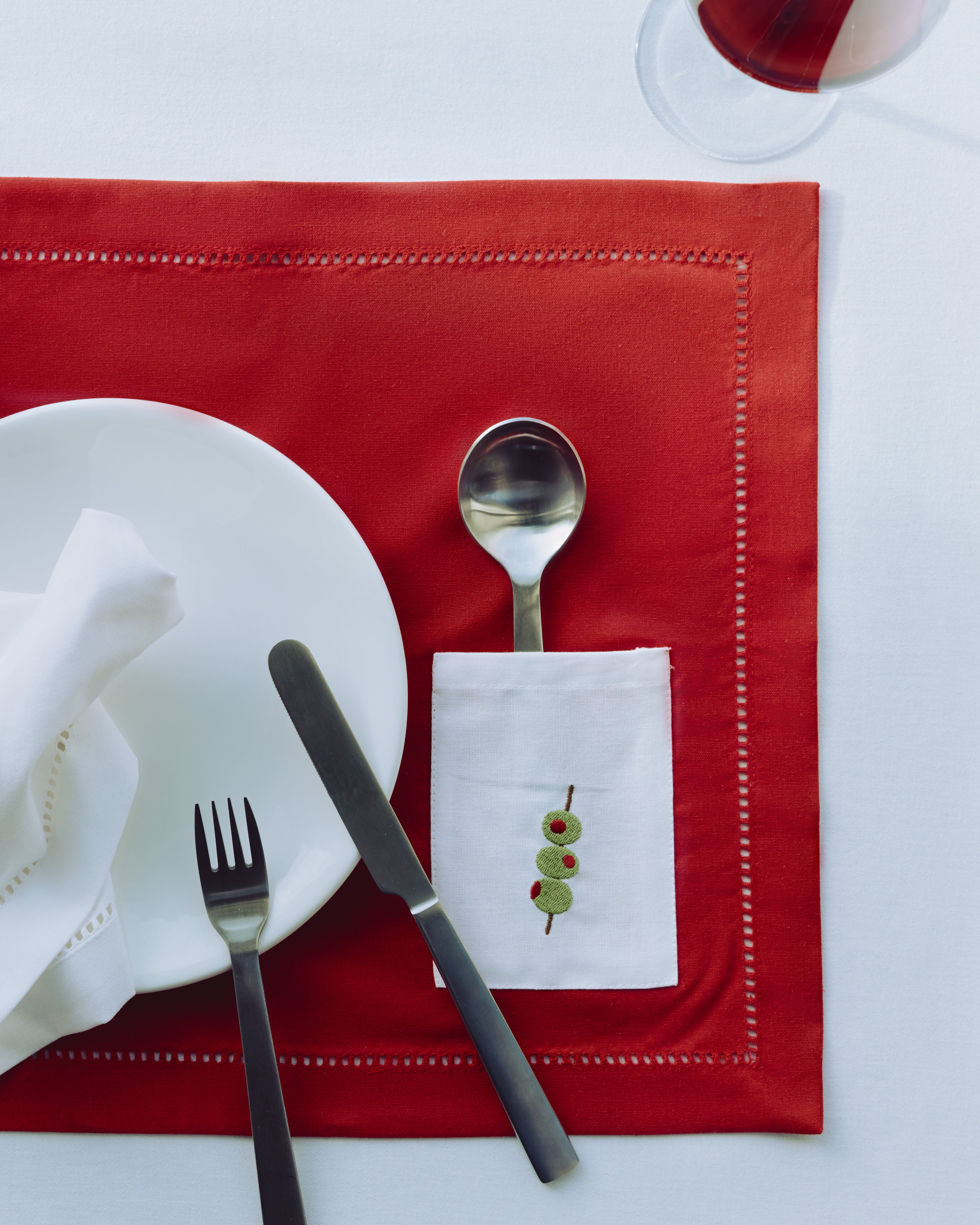 Crafted from premium linen and finished with an elegant hemstitch border, this set includes bright red placemats with crispy white cutlery pockets, and beautifully embroidered with an olive-on-a-stick motif, a cheeky nod to your favourite martini.