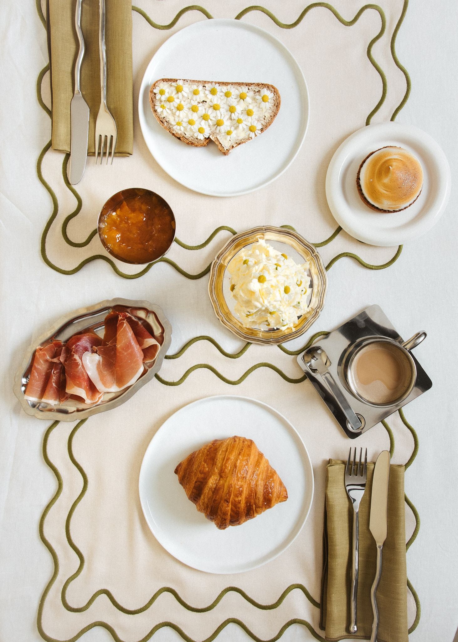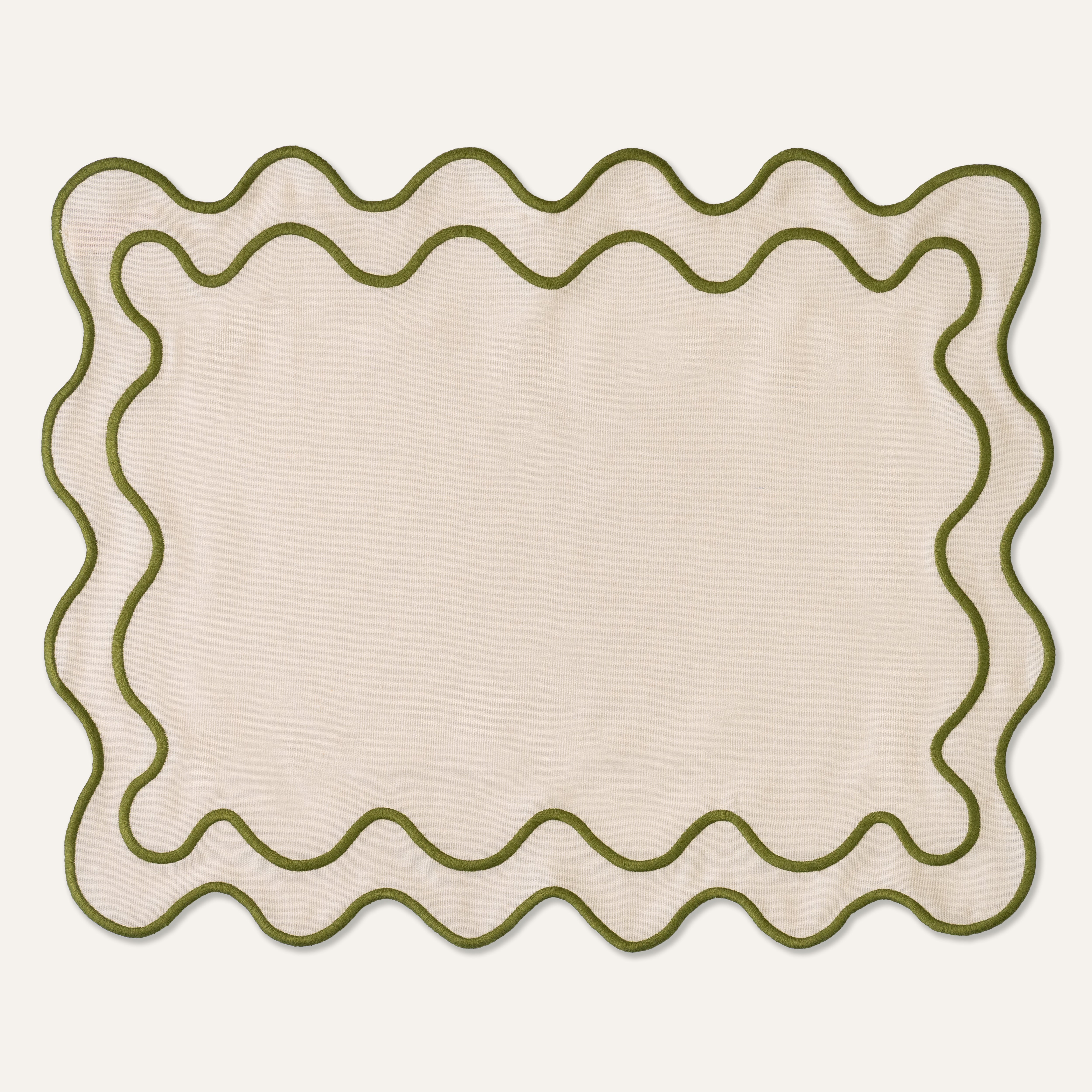 This pair of beige linen-blend placemats in a playful wavy cut and contrasting green embroidery in two wavy patterns adds a touch of sophistication to the dining table.