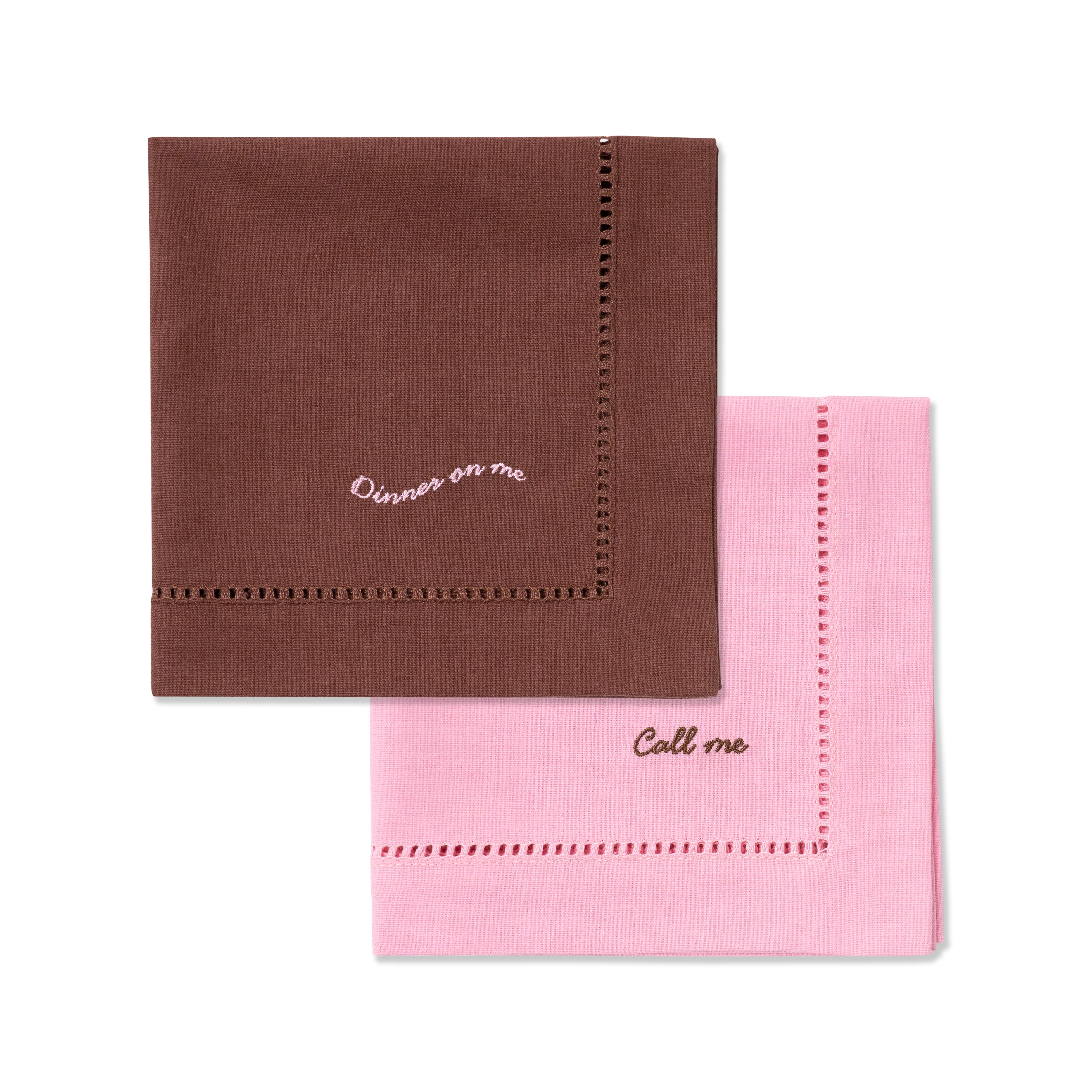 Featuring a deep brown and a soft pink napkin, this duo is made from premium linen and finished with a classic hemstitch edge. Embroidered with the phrases “Call Me” and “Dinner On Me” in playful contrast colours. A subtle wink for your guests.