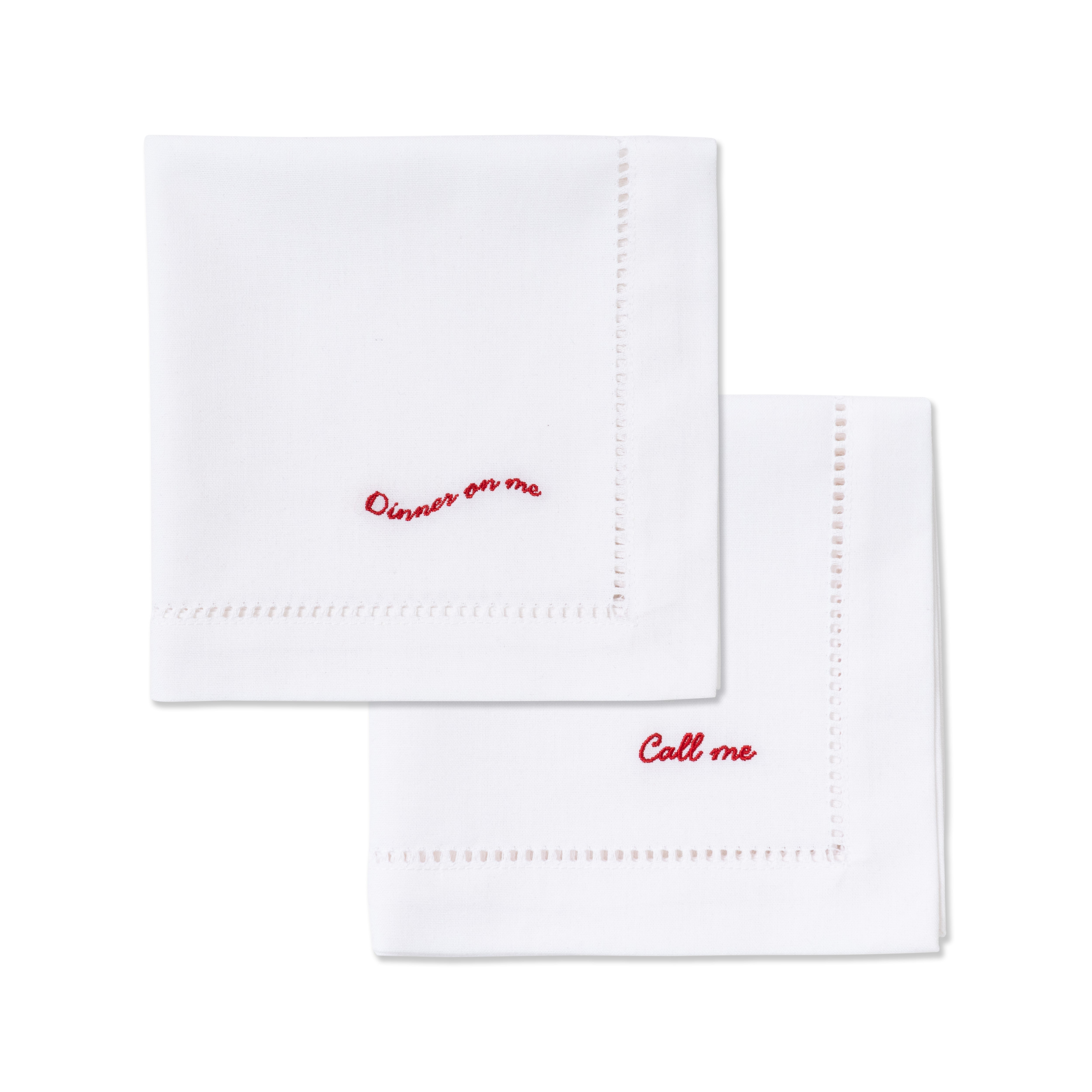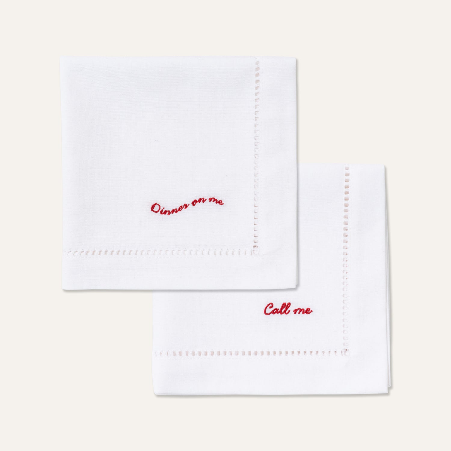 Crafted from premium linen and finished with a refined hemstitch border, this set includes two crisp white napkins embroidered with the playful phrases “Call Me” and “Dinner On Me” in a contrasting red colour. A subtle wink for your guests.