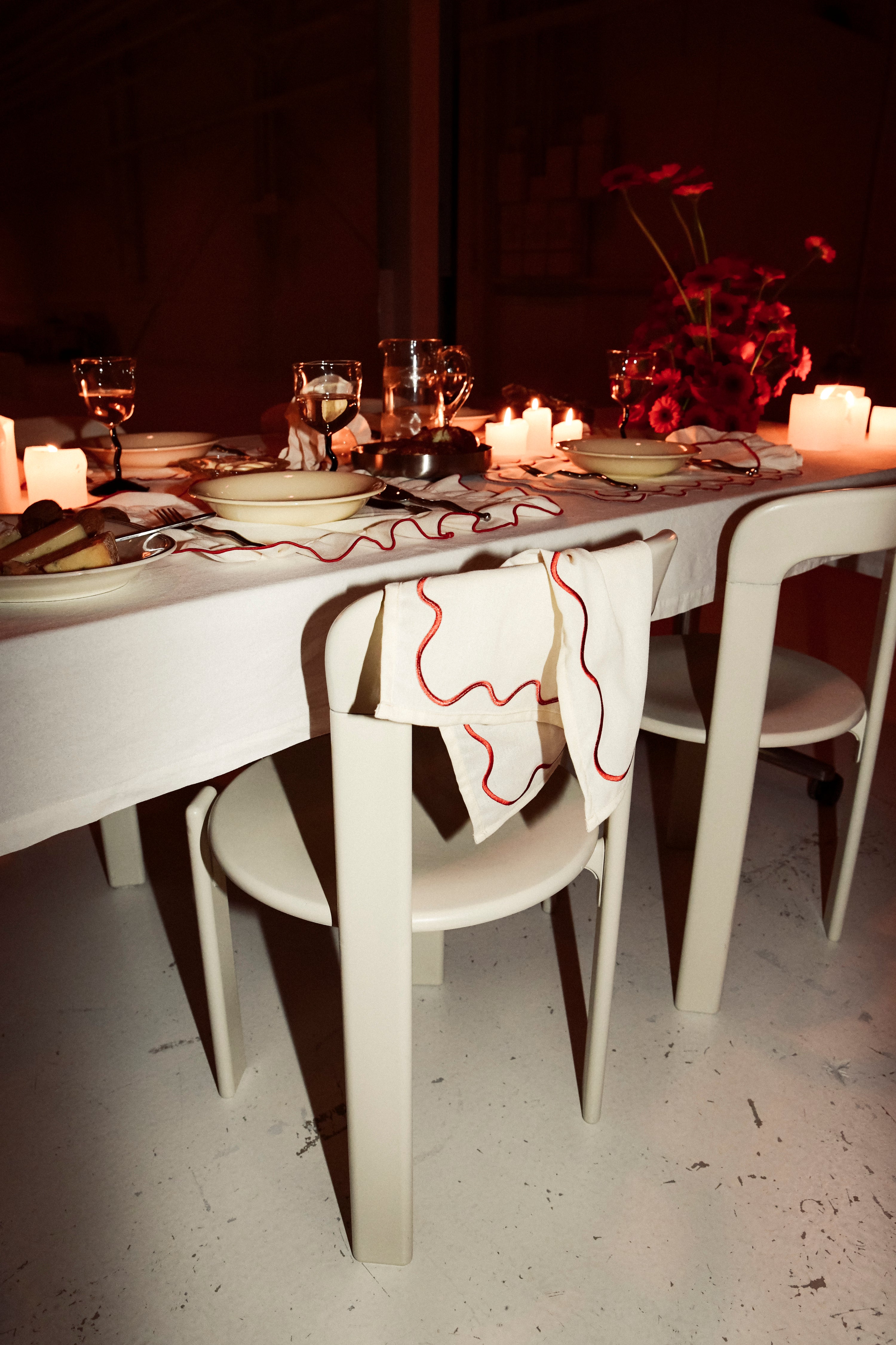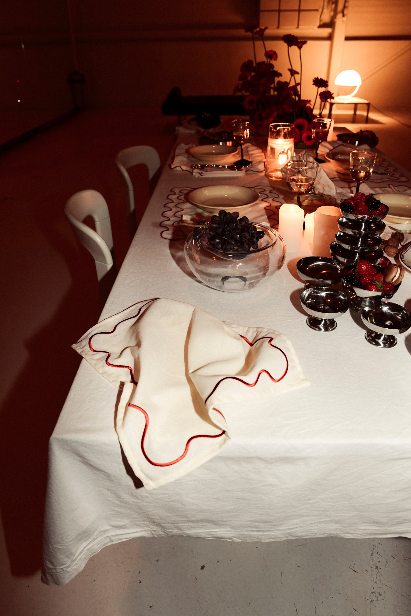 This pair of cream-colored napkins made from a linen blend features playful wavy embroidery in contrasting deep red, from the Kulu Club x Crisp Sheets Christmas collection. These napkins are crafted from high-quality eco-linen and cotton, making them not only stylish and luxurious but also sustainable with a small ecological footprint! So, good for people, the environment, and animals.