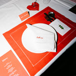 Crafted from premium linen and finished with an elegant hemstitch border, this set includes bright red placemats with crispy white cutlery pockets, and beautifully embroidered with an olive-on-a-stick motif, a cheeky nod to your favourite martini.