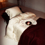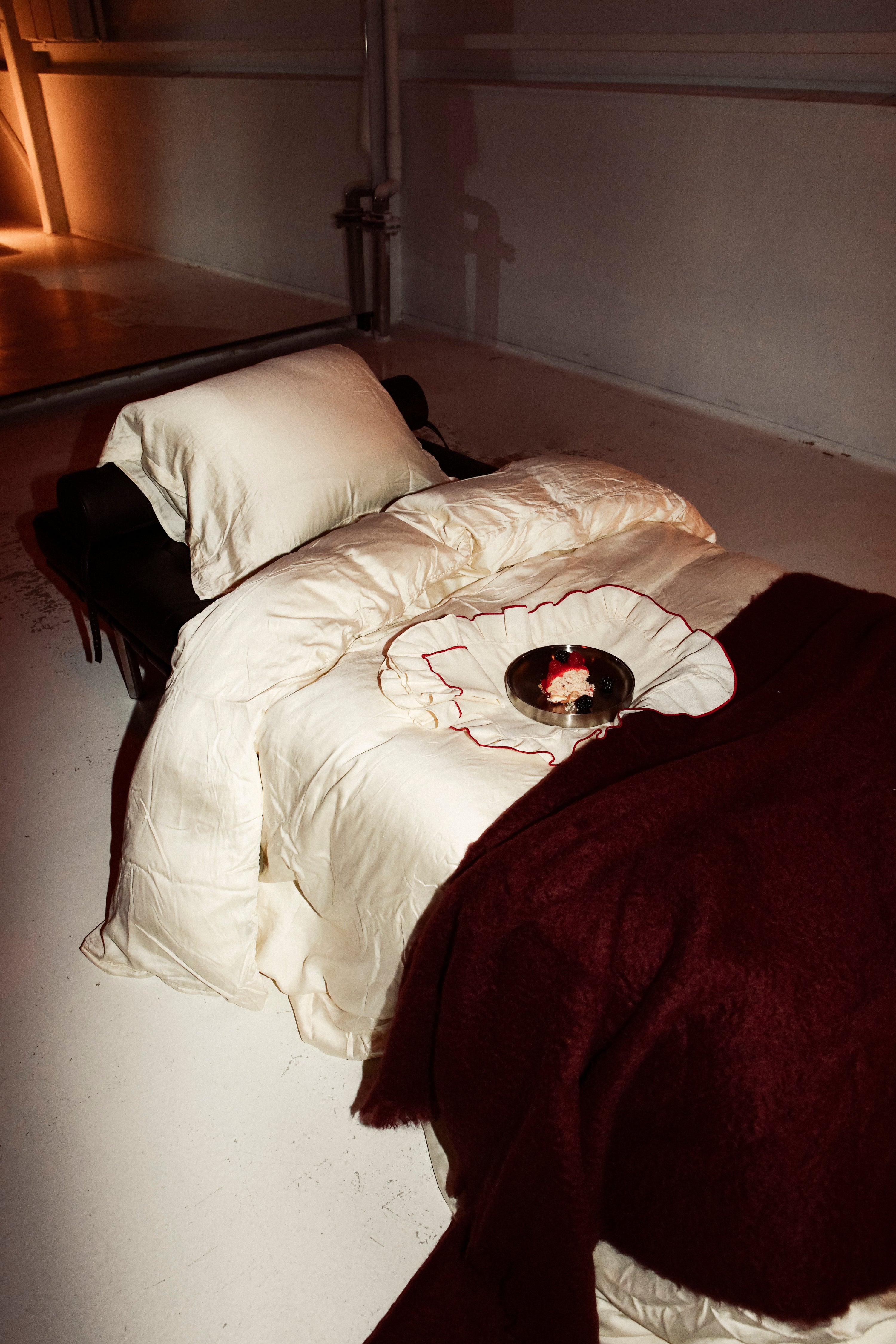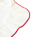 This pair of cream-colored placemats with beautiful frills and contrasting deep red edges is from the Kulu Club x Crisp Sheets Christmas collection. These placemats are made from high-quality eco-linen and cotton, making them not only stylish and luxurious but also sustainable with a small ecological footprint! So, good for people, the environment, and animals.