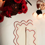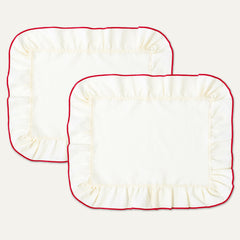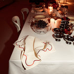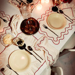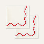 This pair of cream-colored napkins made from a linen blend features playful wavy embroidery in contrasting deep red, from the Kulu Club x Crisp Sheets Christmas collection. These napkins are crafted from high-quality eco-linen and cotton, making them not only stylish and luxurious but also sustainable with a small ecological footprint! So, good for people, the environment, and animals.