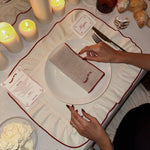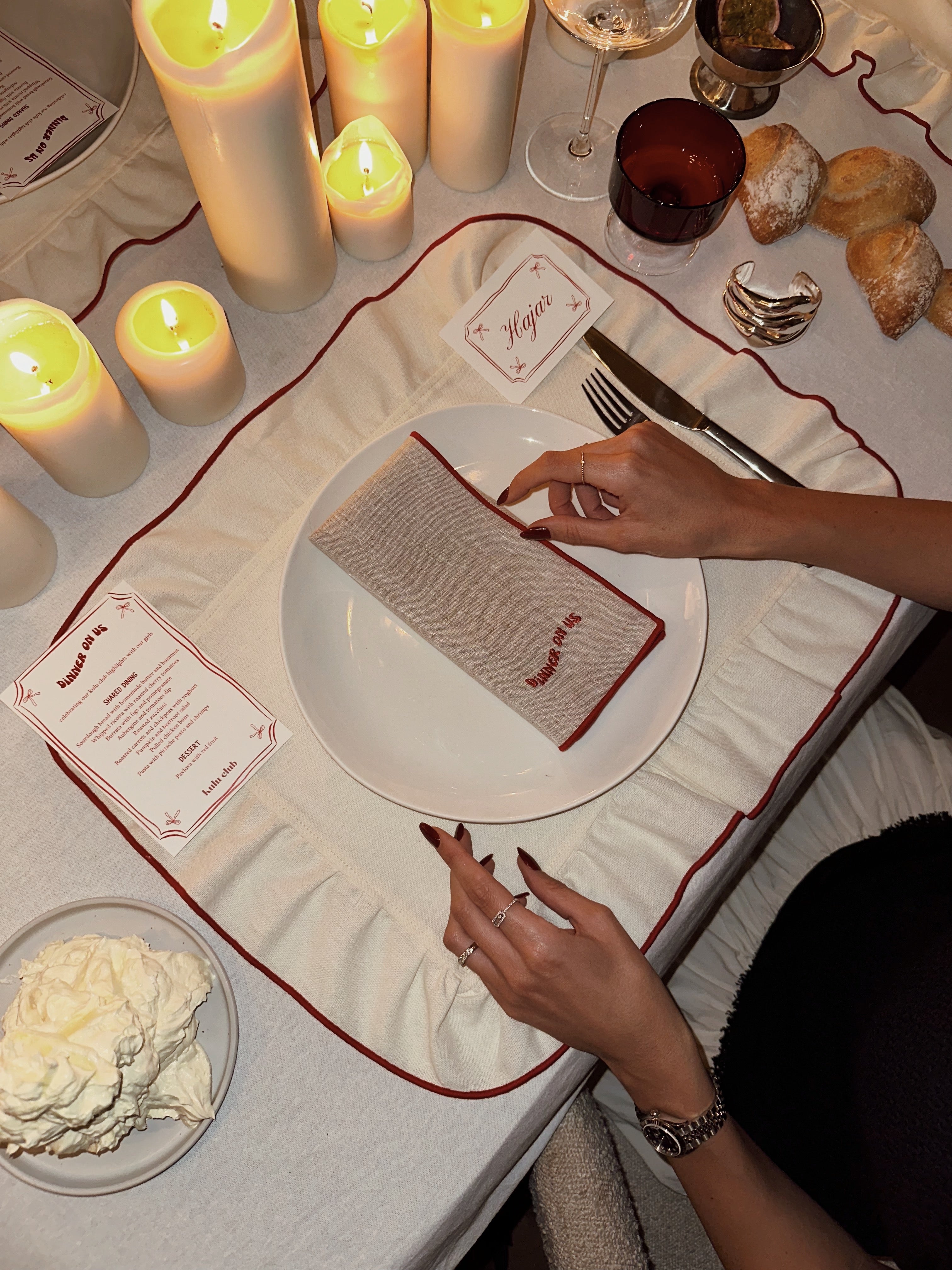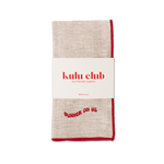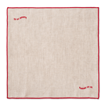 Dit paar 100% linnen servetten in beige, met de tekst "dinner on us" in rood geborduurd op beide uiteinden, brengt een gedurfde en speelse uitstraling aan je eettafel.