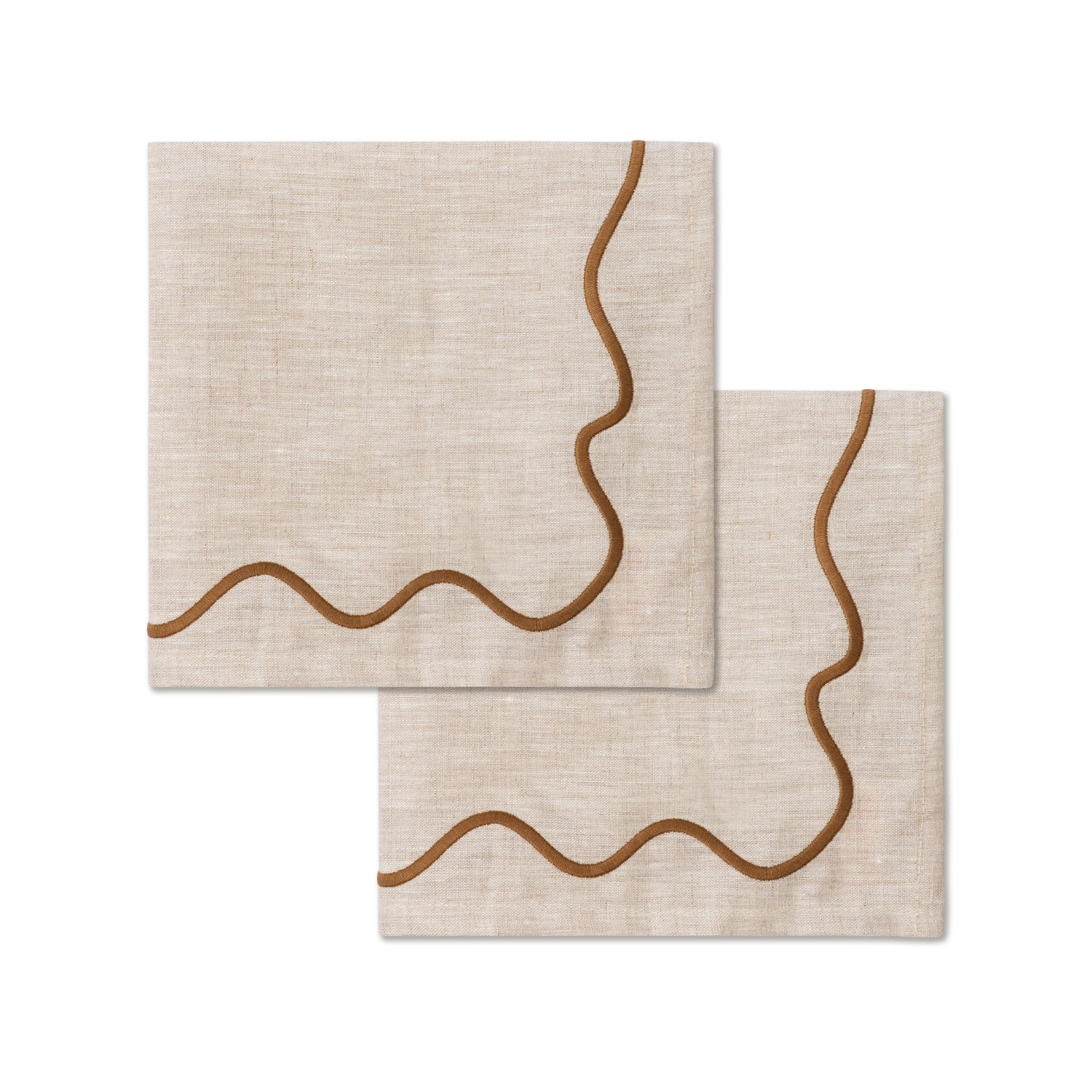 Dit paar servetten van 100% linnen in een elegante beige kleur, met speels wavy borduurwerk in contrasterend bruin, voegt een vleugje verfijning toe aan de eettafel.