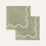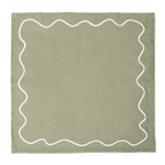 Dit paar 100% linnen servetten van de Kulu Club x Benthe Liem collectie zijn saliegroen met speels wavy borduurwerk in contrasterend off-white. Deze servetten zijn vervaardigd van hoogwaardig eco-linnen en dus niet alleen stijlvol en luxueus, maar ook duurzaam met een klein ecologisch voetprint! Dus goed voor mens, milieu en dier.