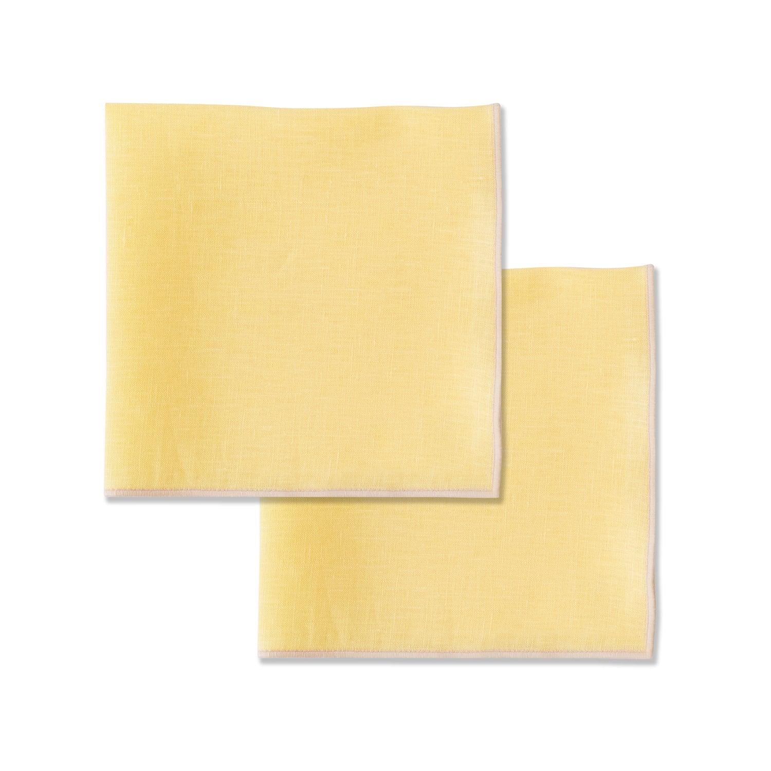 Dit paar 100% linnen servetten in een zachte gele kleur, met ivoorwitte randen, voegt een vleugje verfijning toe aan de eettafel.