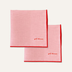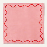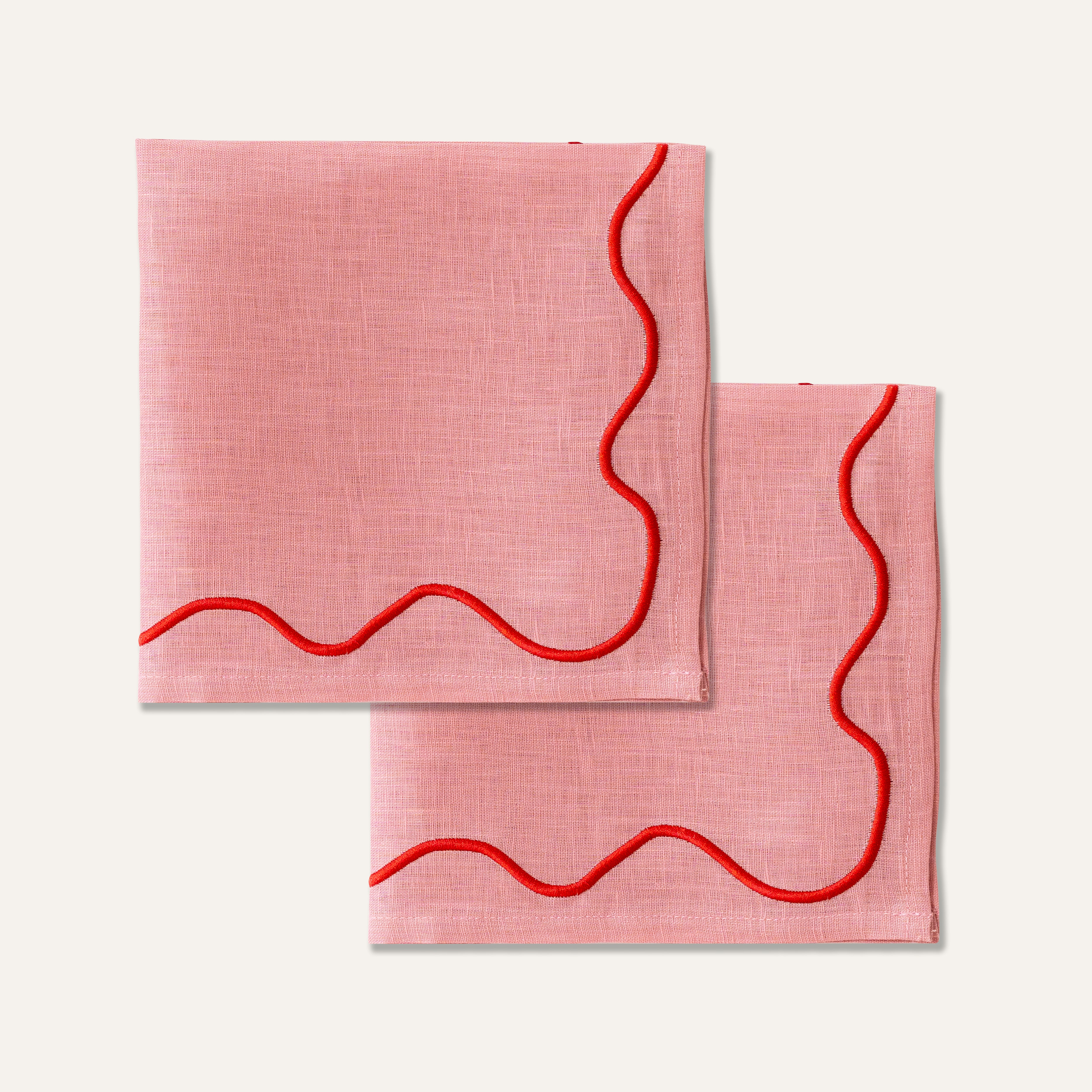 Dit paar servetten van 100% linnen in een mooie roze kleur, met speels wavy borduurwerk in contrasterend rood, voegt een vleugje verfijning toe aan de eettafel.