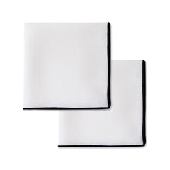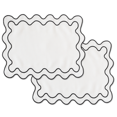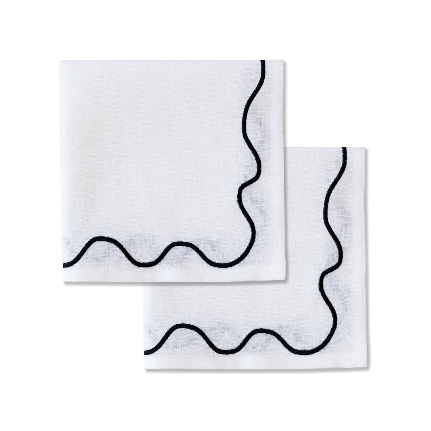 Dit paar servetten van 100% linnen in de kleur wit, met speels wavy borduurwerk in contrasterend zwart, voegt een vleugje verfijning toe aan de eettafel.