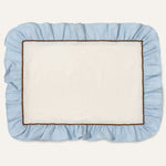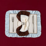 Dit paar ruffle placemats in een ivoorwitte tint met een ijsblauwe volant en bruine overlock rand is onderdeel van onze Ruffle collectie. De elegante volant-rand geeft een speelse, romantische touch aan elke tafelschikking, perfect voor een uitnodigende en stijlvolle tafelsetting.