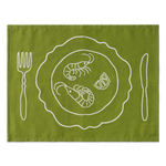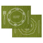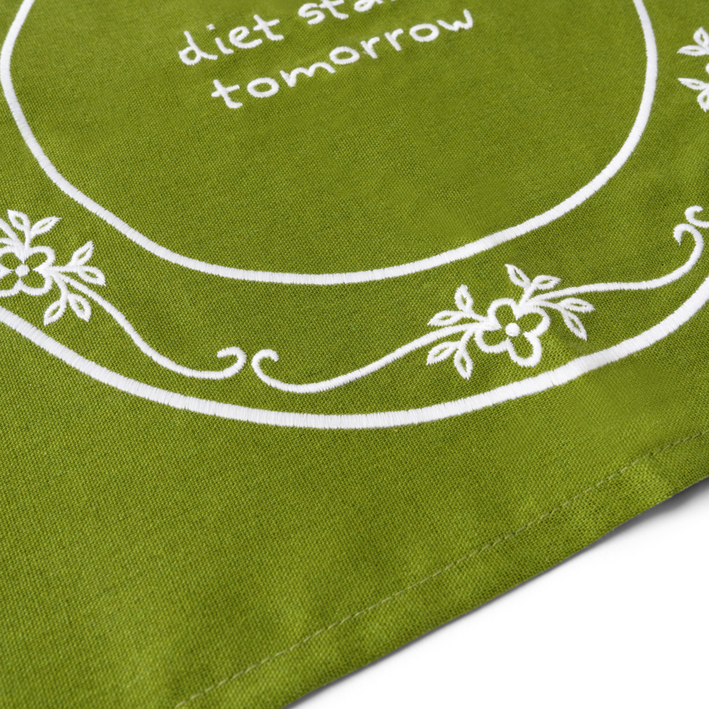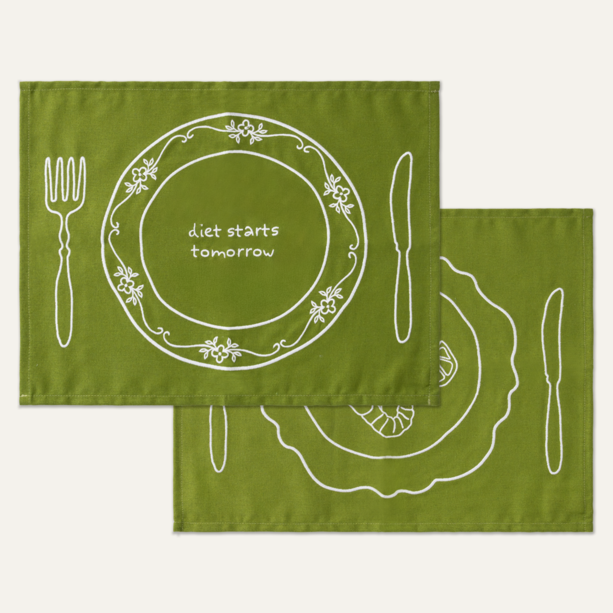 Diet starts tomorrow – of overmorgen. Dit setje groene placemats van is een echte blikvanger aan tafel. Op de placemats zijn vintage borden in het wit geborduurd – de één gevuld met garnalen, de ander met de tekst diet starts tomorrow.