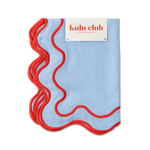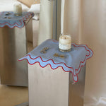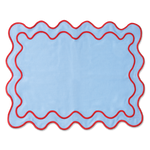 Dit paar blauwe placemats van linnenmix met een speelse golvende snit en contrasterend rood wavy borduurwerk voegt een vleugje verfijning toe aan de eettafel.