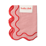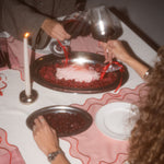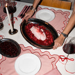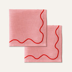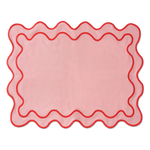Dit paar roze placemats van linnenmix met een speelse golvende snit en contrasterend rood wavy borduurwerk voegt een vleugje verfijning toe aan de eettafel.