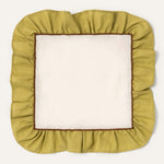 Dit paar ruffle servetten in een ivoorwitte tint met een groene volant rand is en bruine overlock rand onderdeel van onze Ruffle collectie. De elegante volant-rand geeft een speelse, romantische touch aan elke tafelschikking, perfect voor een uitnodigende en stijlvolle tafelsetting.